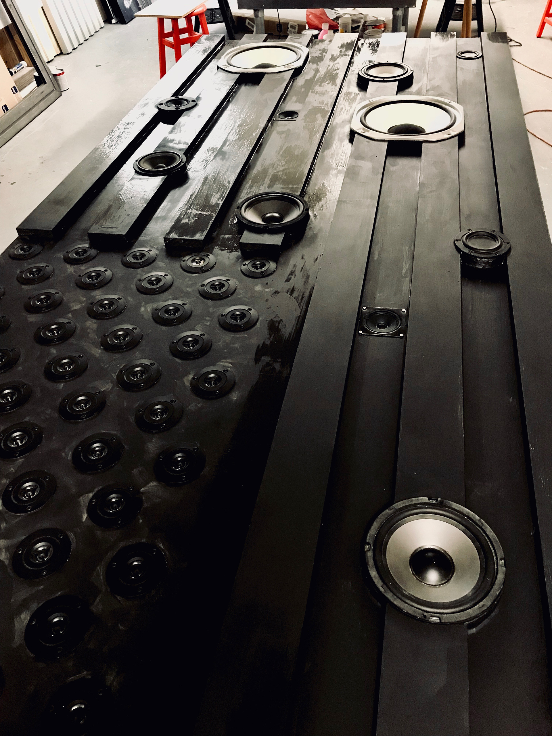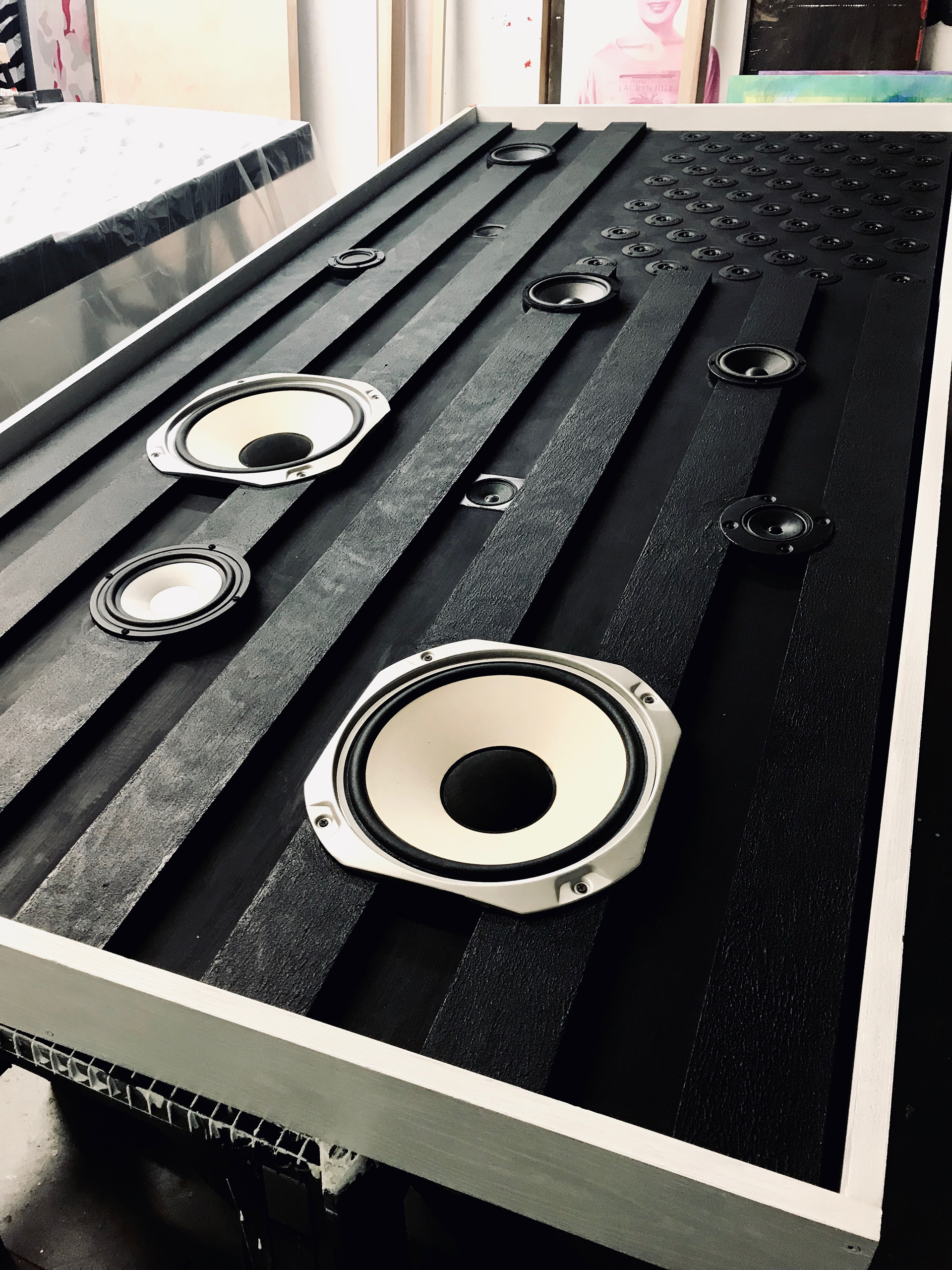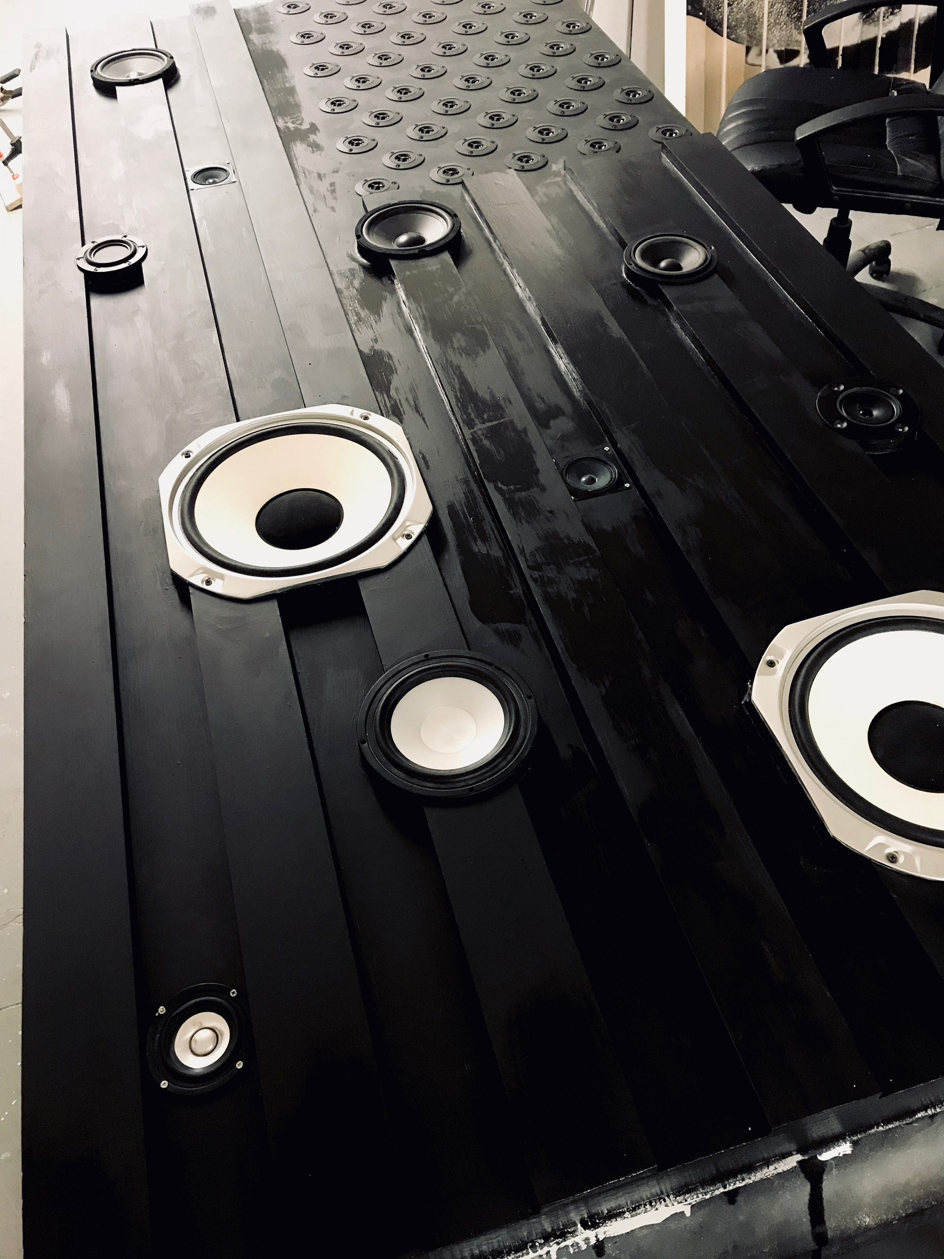 45.5" X 96" / Wood, black concrete paint, functioning speakers, Bluetooth technology