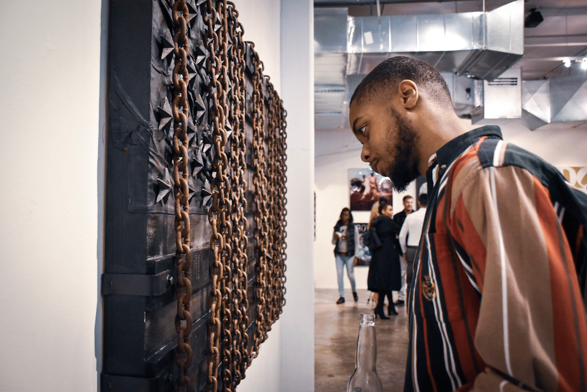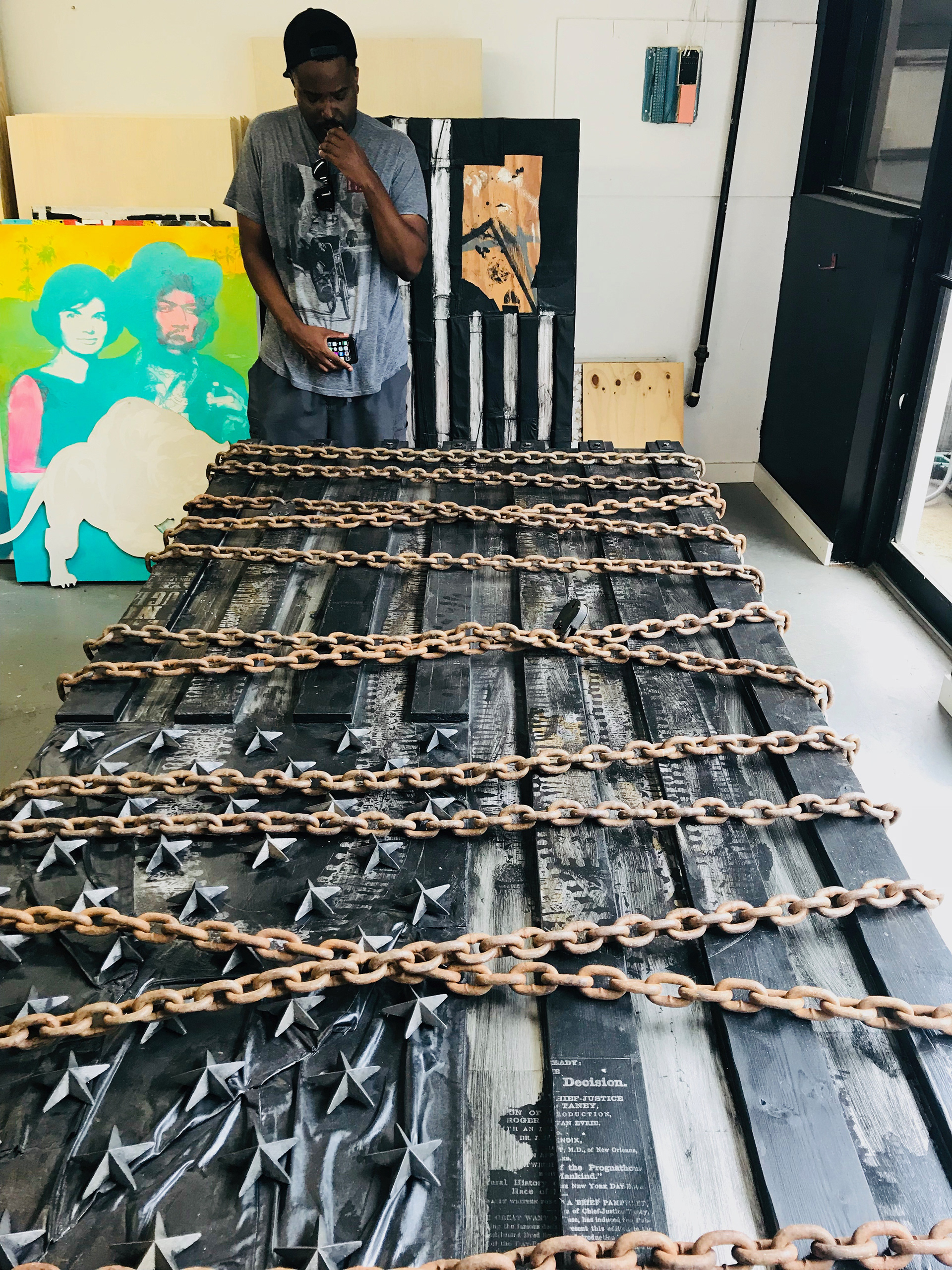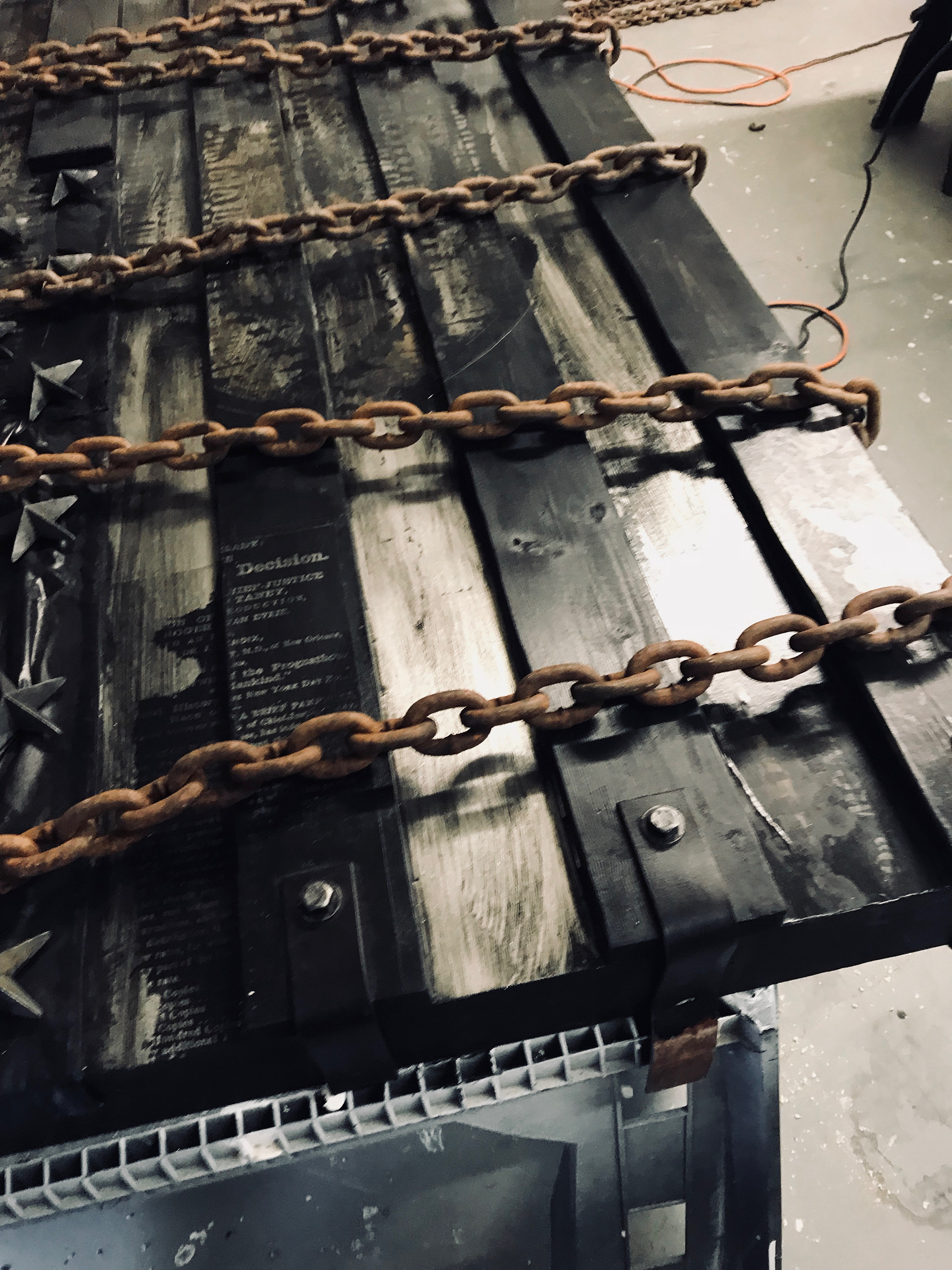 45.5" X 96" / Wood, paint, cast iron stars, steel chains, silver leaf, leather and collage