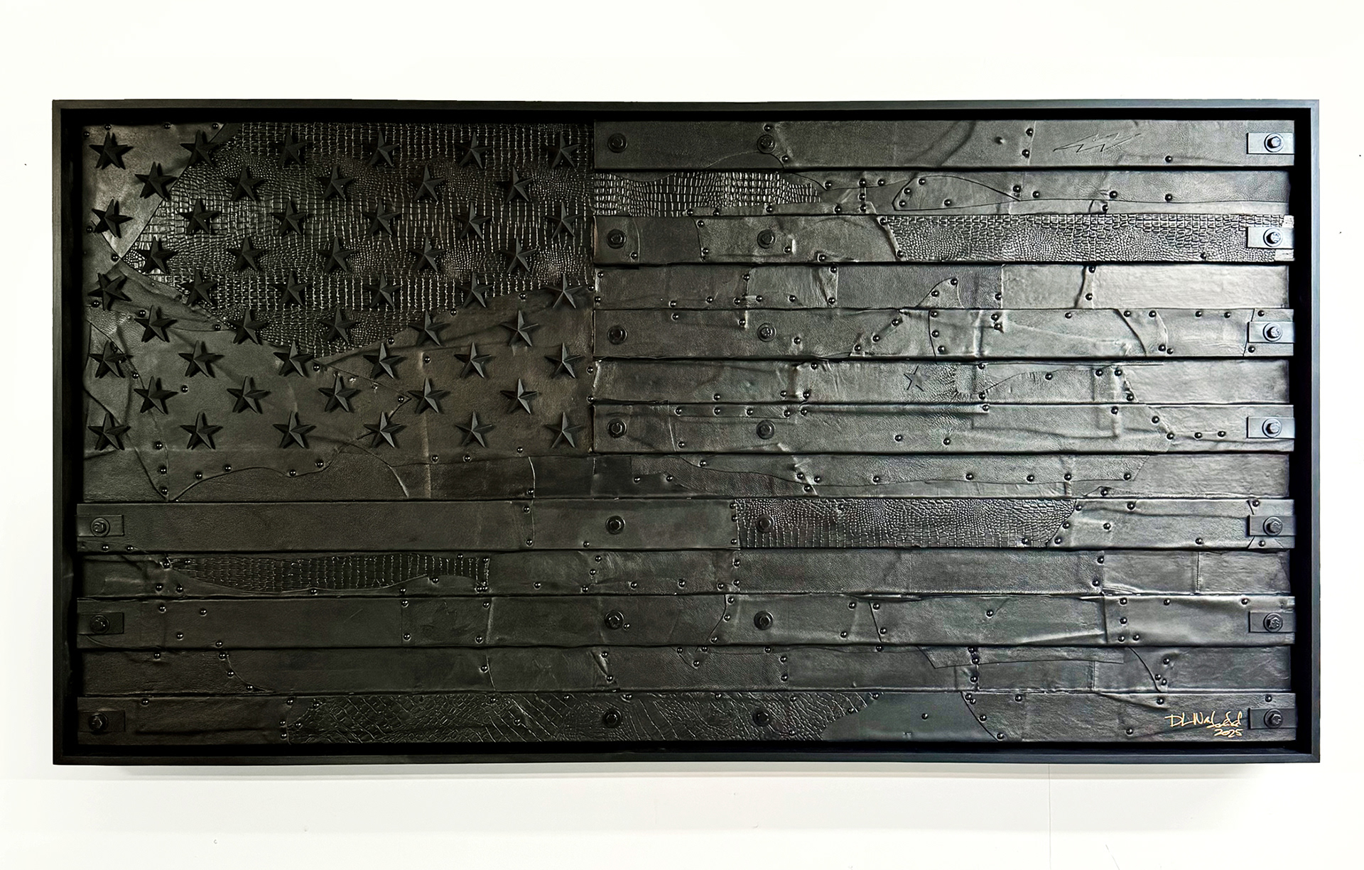 96" x 45.5" - Black reclaimed leather, steel bolts, iron stars on wood panel