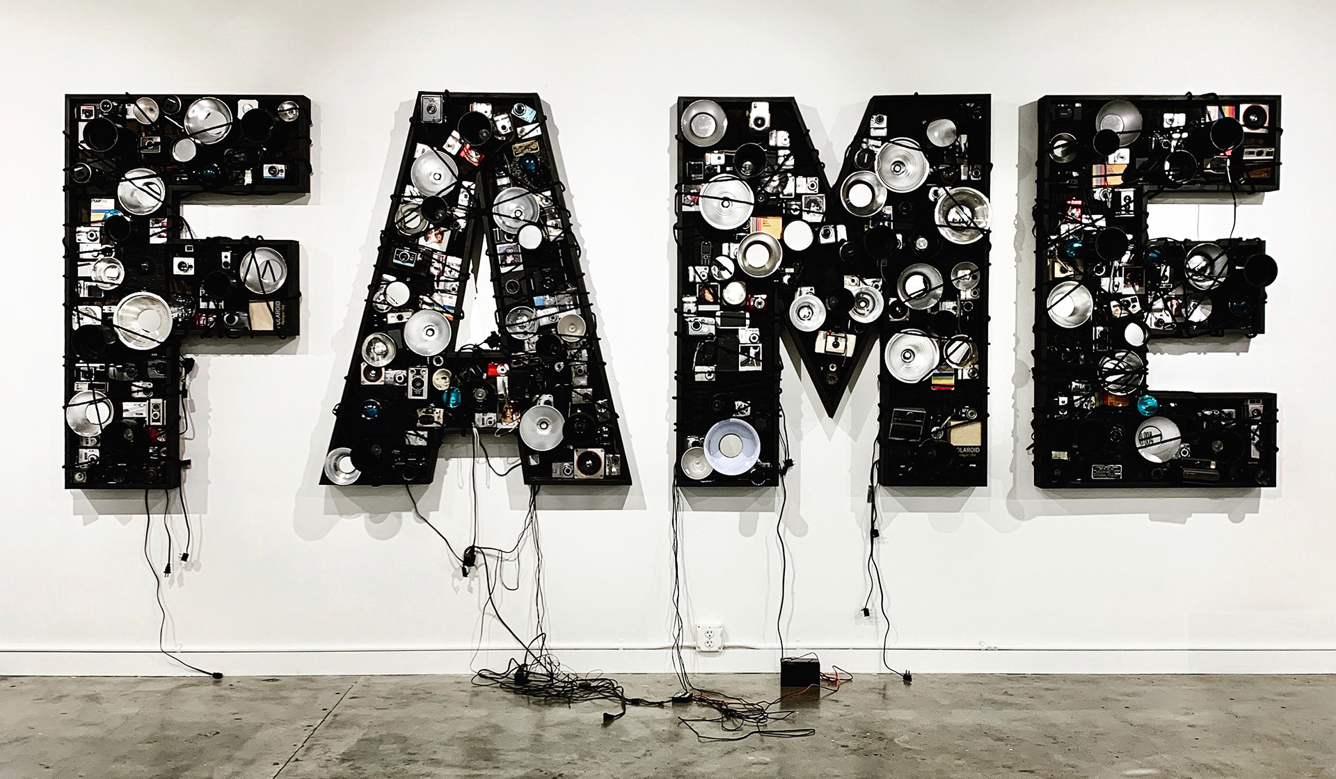 FAME / Each letter is filled with cameras and working flashes. Dimensions for each letter is 3' x 5' or 4' x5'.